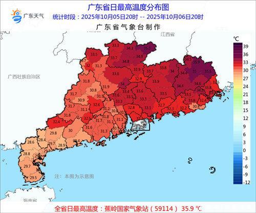 6日白天最高气温分布:粤北大部、珠三角北部、粤东的北部市县、惠州33~35℃,其中梅州蕉岭录得全省最高气温35.9℃,雷州半岛29~30℃,其余市县普遍介于31~32℃。7日早晨最低气温分布:粤西、珠三角中南部、粤东、梅州24~26℃,其余市县21~23℃,其中河源连平录得全省最低气温21.2℃。