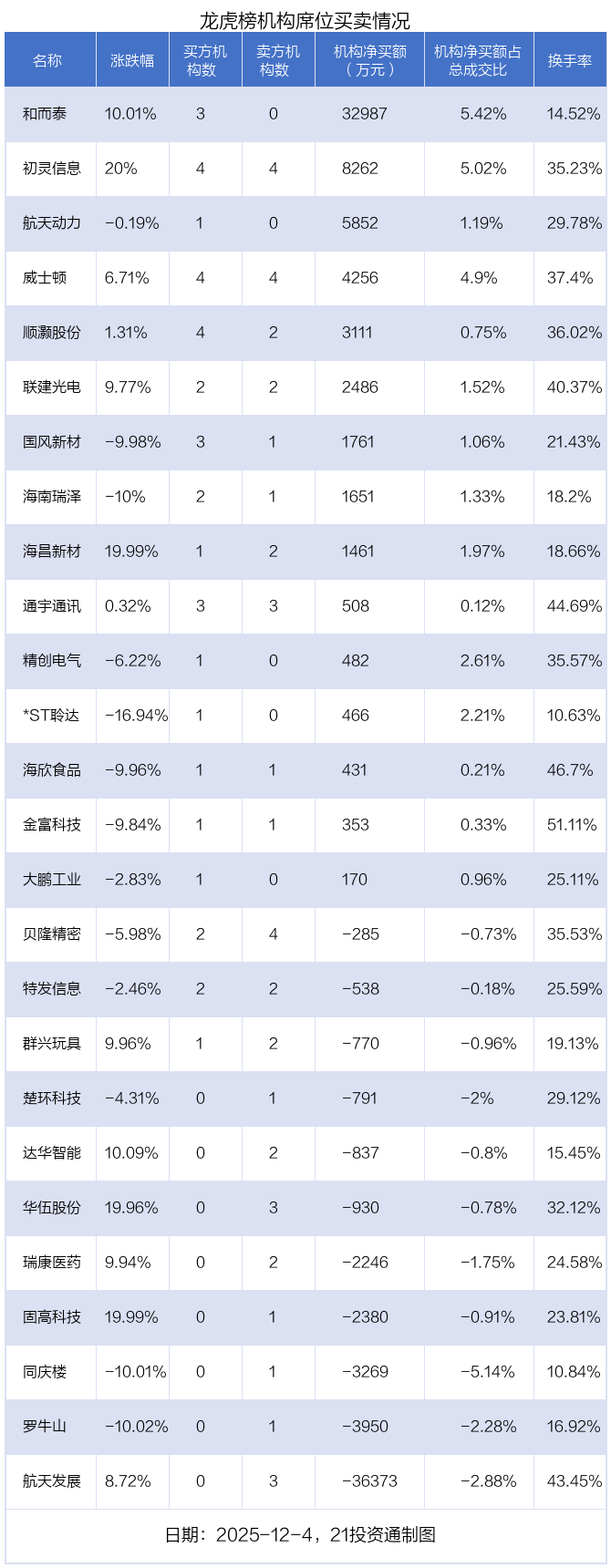 机构净卖出的个股中,金额最多的是航天发展(000547.SZ),当日收盘上涨8.72%,换手率为43.45%。前五大买卖营业部中有0家机构,净卖出0万元,占总成交金额的0%。