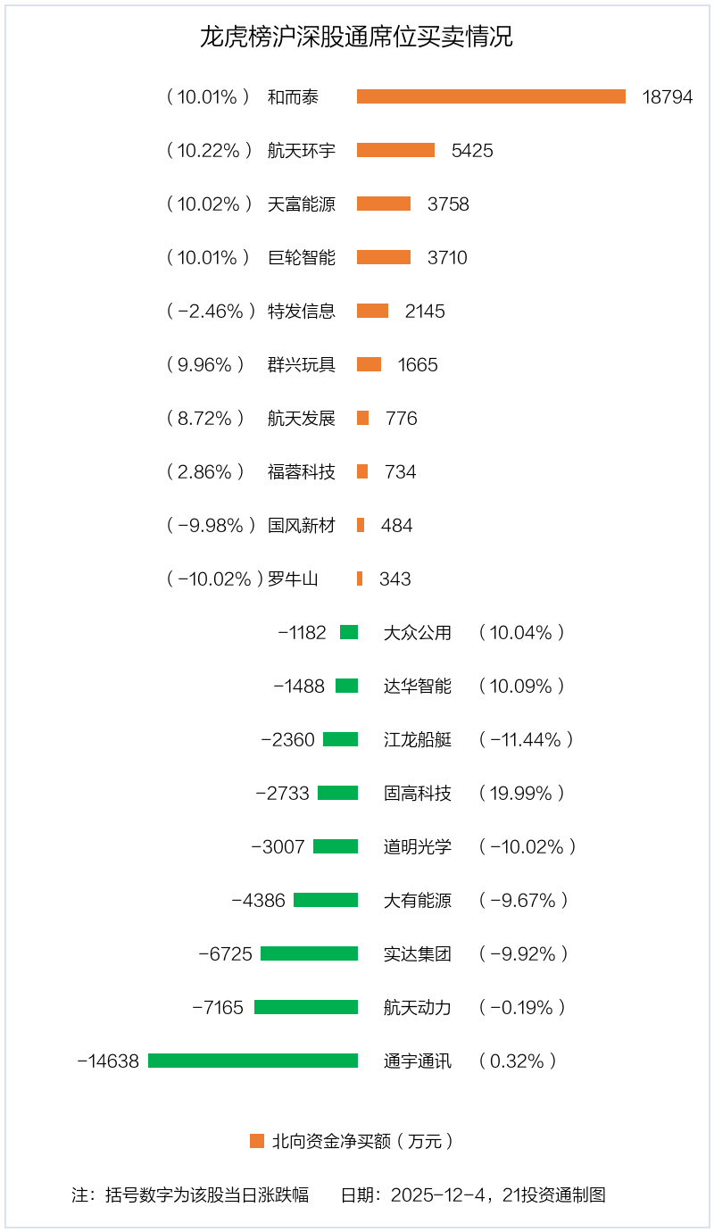 值得注意的是,机构和北向资金共同净买入了和而泰、国风新材;共同净卖出了达华智能、固高科技;在特发信息,群兴玩具,航天发展,罗牛山,航天动力,通宇通讯上出现分歧,机构净卖出特发信息537.55万元,北向资金净买入2145.36万元;机构净卖出群兴玩具770.08万元,北向资金净买入1664.51万元;机构净卖出航天发展3.64亿元,北向资金净买入776.43万元;机构净卖出罗牛山3949.85万元,北向资金净买入343.07万元;机构净买入航天动力5852.45万元,北向资金净卖出7165.25万元;机构净买入通宇通讯507.54万元,北向资金净卖出1.46亿元。